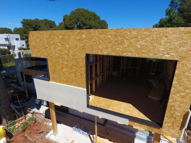 Recubrimiento perimetral de panel OSB/3 para arriostramiento de fachada y cubierta.